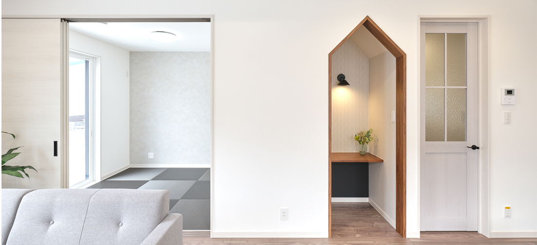 この住まいの設計では、「暮らしの中にやさしいアクセントを」という想いを込めて、三角アーチのワークスペースをLDKの一角に設けました。