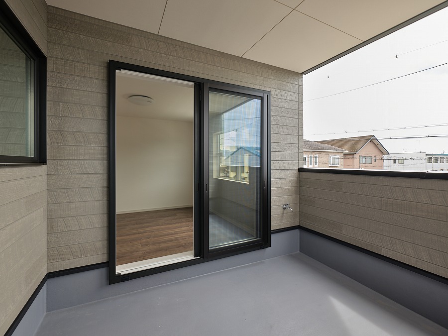 木目柄のスモークシルバーが上品な質感を演出し、バルコニーのホワイトレンガ調とのコントラストが美しく際立つ外観デザイン。