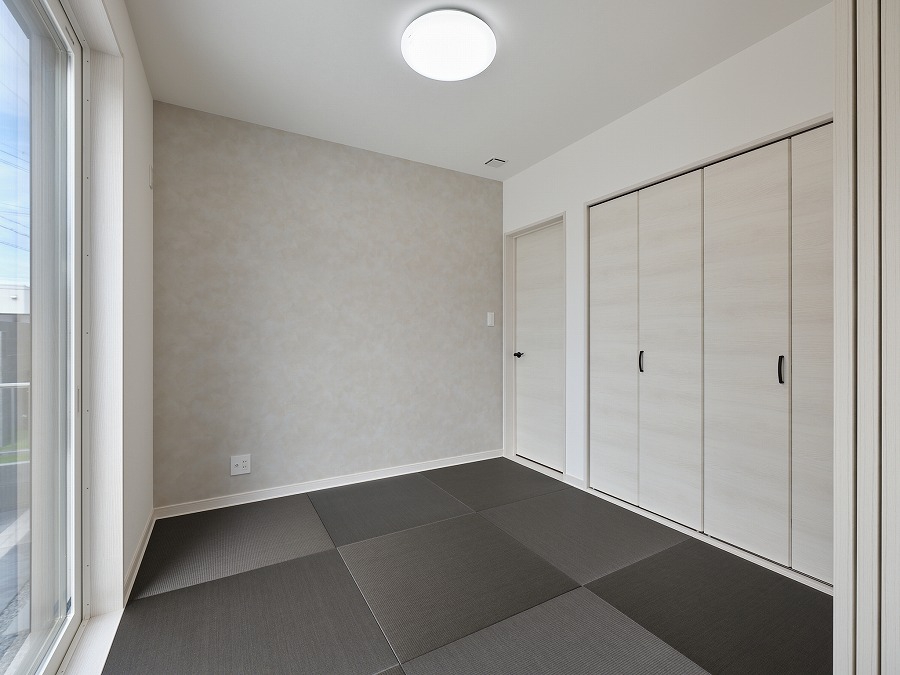 落ち着いたチャコールカラーが印象的なセキスイ畳「MIGUSA」を採用した和室。色褪せしにくく高い耐久性のある高機能素材で、和の趣と現代的なスタイルを絶妙に融合。