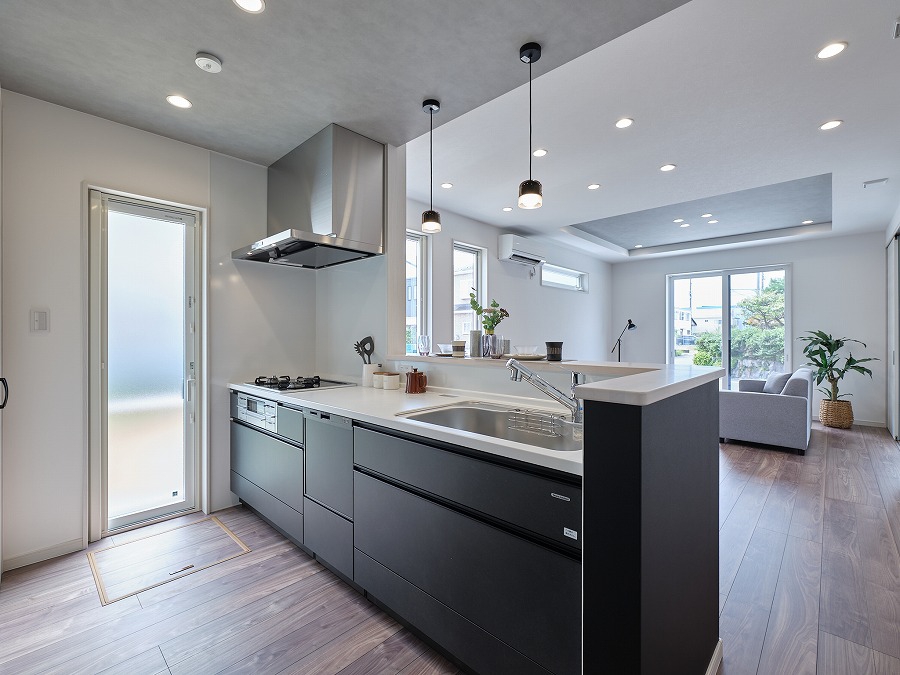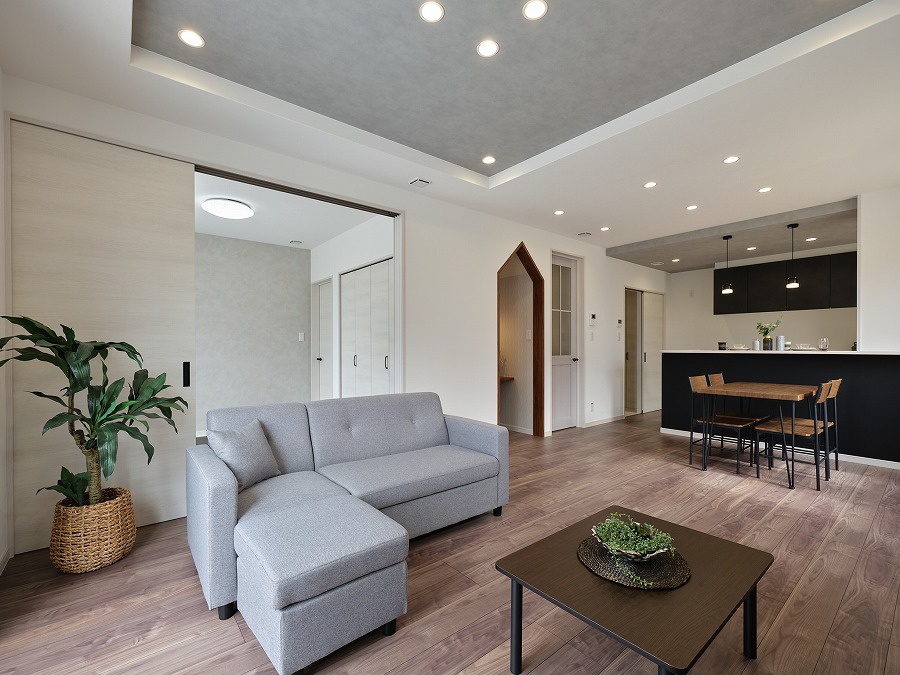 LDKの床材にはリクシルのウォルナットFを採用し、木の質感が空間に温もりをプラス。ブラックのキッチンや照明がアクセントとなり、モダンで洗練された印象に。