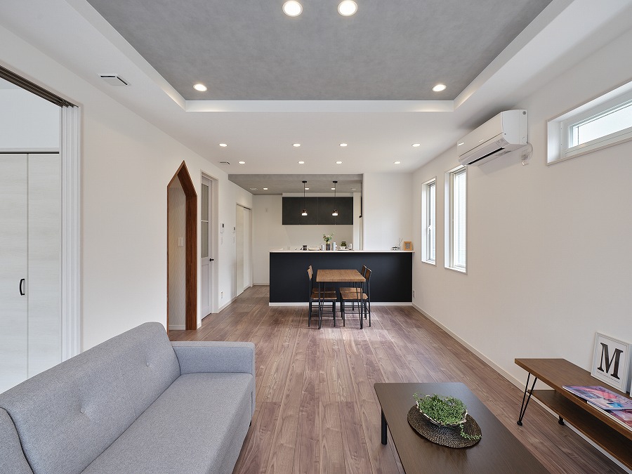 折り下げ天井と折り上げ天井を同色カラーにすることで、空間にメリハリを持たせながらも、全体の統一感を演出したモダンなLDK。