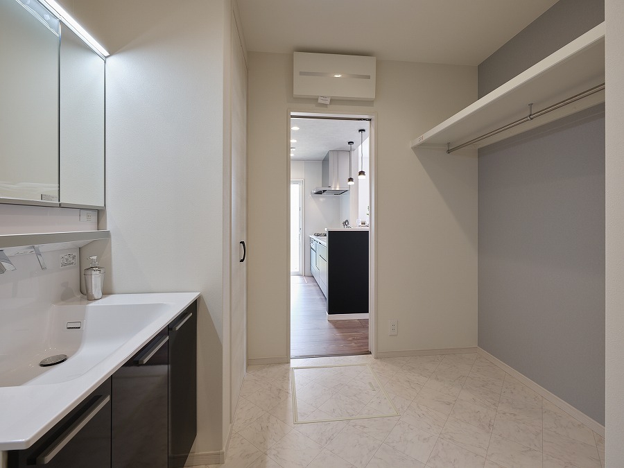 キッチン横に配置された洗面・ランドリールーム・収納は、家事の効率を高める理想的なレイアウト。床は上品なビアンコカララ調のクッションフロアを採用。