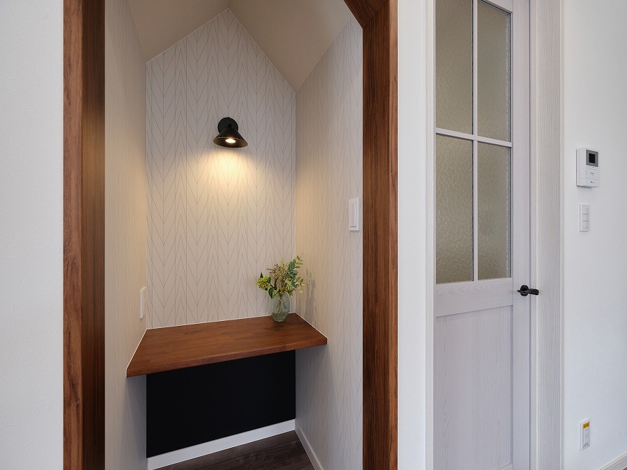 北欧テイストで仕上げたこだわりの造作 三角アーチのワークスペース。幾何学模様のクロスが遊び心を添え、木の温もりと照明が絶妙なバランスで調和。