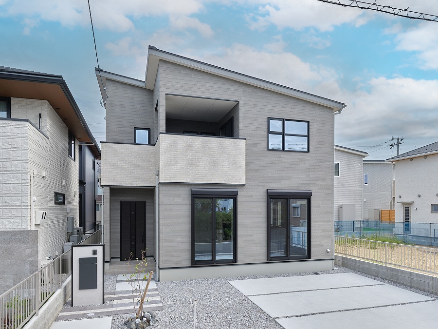 落ち着いたスモークシルバーの外壁に、ブラックの窓枠が映えるシンプルで洗練された外観。直線的なフォルムと大きな窓が、北欧モダンらしい開放感と明るさを演出します。