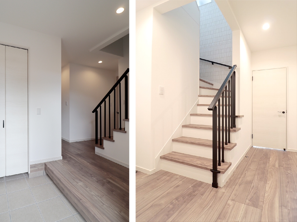 黒のアイアン手摺が空間を引き締める、スタイリッシュな階段ホール。 階段正面には、北欧調のアクセントクロスを取り入れました。