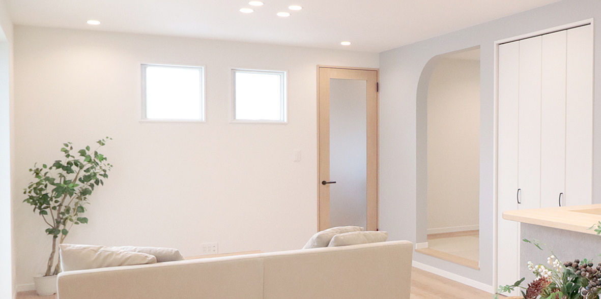 アーチ壁の優しいラインが印象的なリビング空間。白を基調とした壁と明るい木目の床が、自然光を取り込みながら穏やかな時間を演出。家事効率を高める 理想的な生活導線
