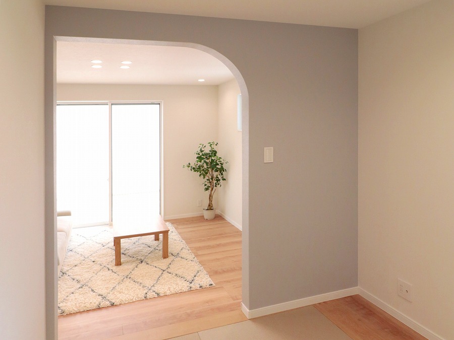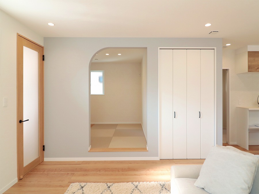 LDKから続く和室は、アーチ型の開口部を通してやさしく空間がつながる設計。