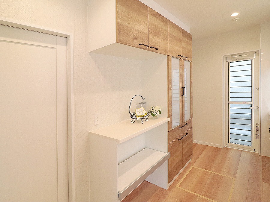 キッチン背面には、さりげなく空間を彩るヘリンボーン柄のアクセントクロスを採用。木目調のカップボードとの相性も良く、ナチュラルで温かみのある雰囲気に。