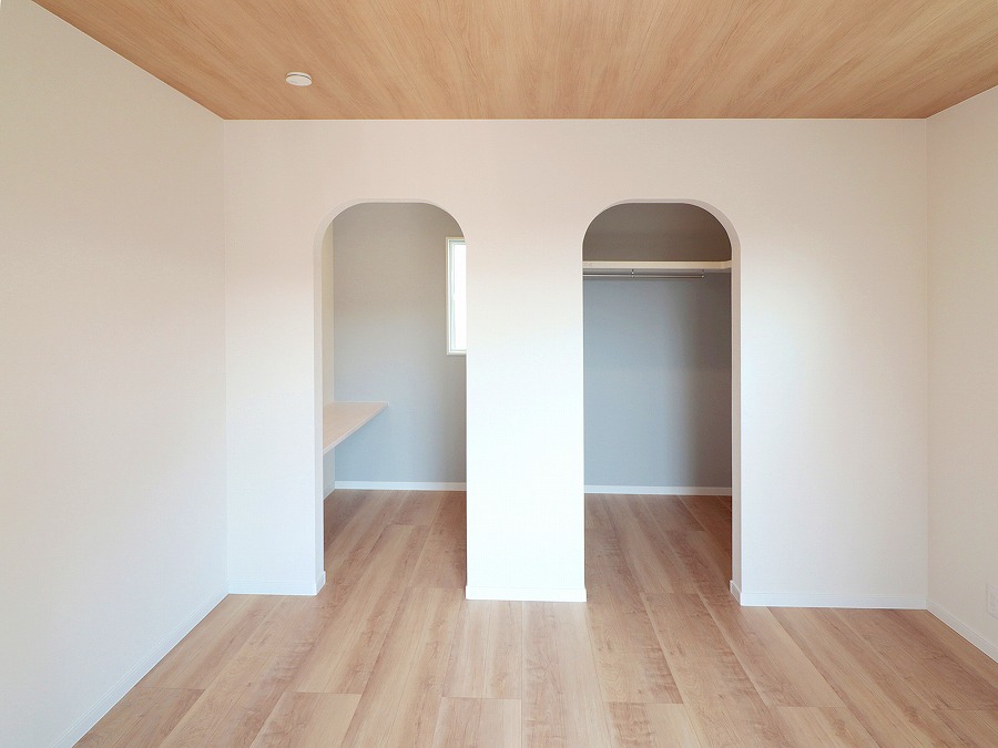 2つ並んだ寝室のアーチ壁の奥には、ペールブルーで統一された書斎スペースとウォークインクローゼットが広がります。