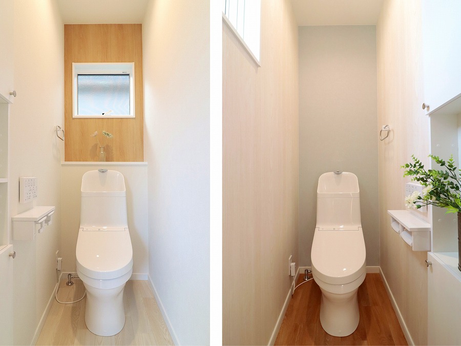 トイレは住まい全体の色使いと調和するカラーでまとめつつ、印象を少しずつ変えて統一感を演出。