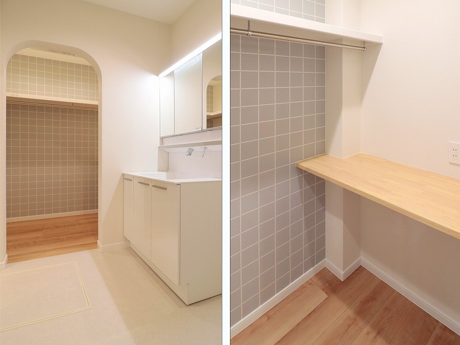 アーチ壁でやさしく仕切られた洗面室の奥には、作業台とファミリークローゼットを配置。日々の身支度や家事がスムーズに行えます。