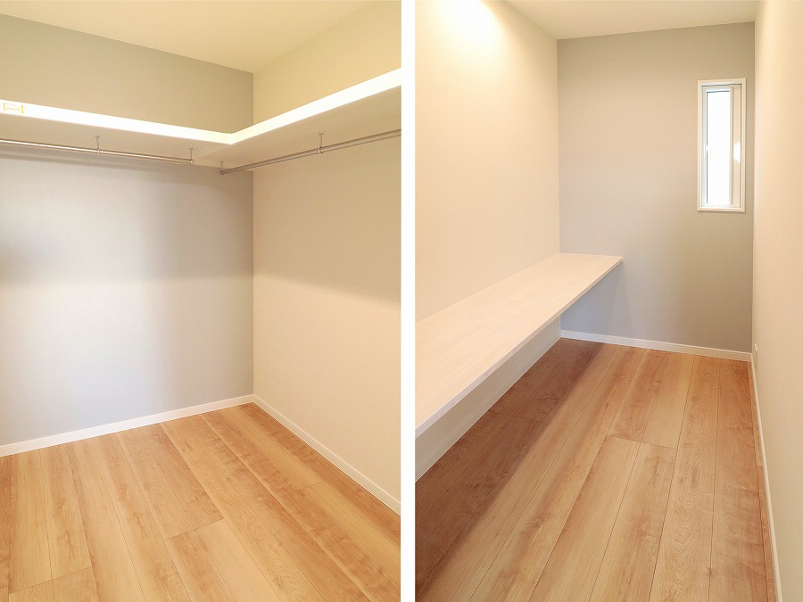 寝室に隣接する書斎スペースとウォークインクローゼットは、造作のデスクと棚を白色で統一し、すっきりとした印象に。