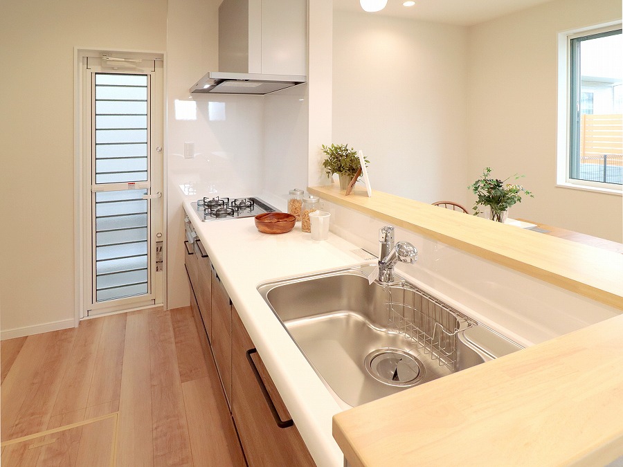 キッチンは標準仕様のクリナップ「ラクエラ」を採用。ライトオークの木目調が空間全体にナチュラルなまとまりを生み出します。