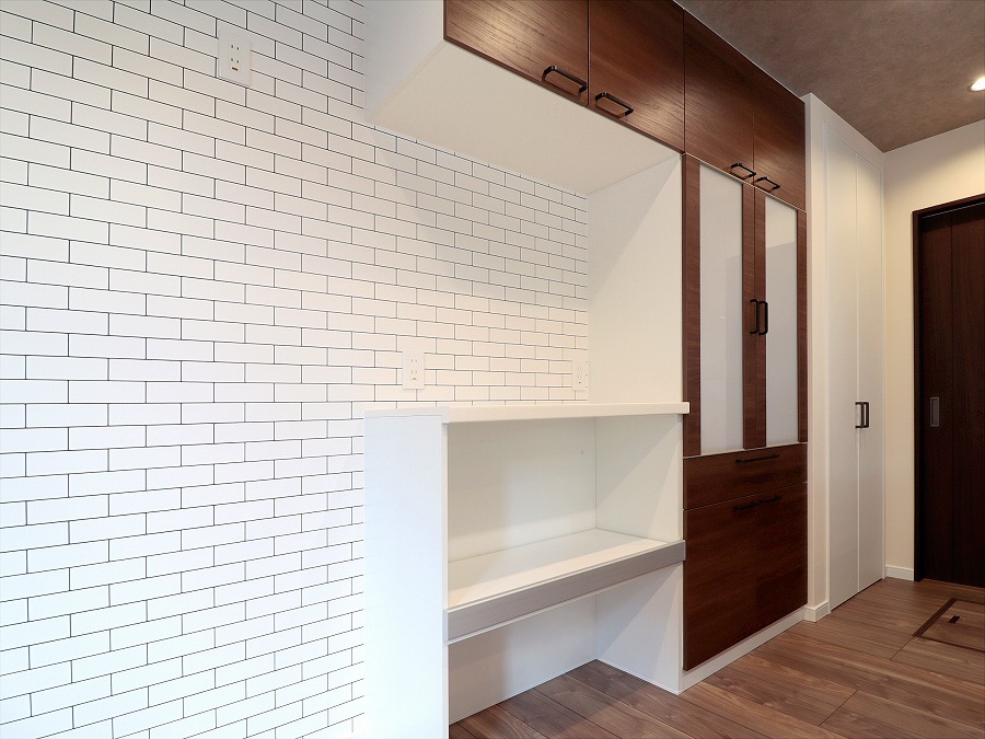 タイル調クロスが落ちついた雰囲気に軽やかさを加え、カップボードの木目とも美しく馴染みます。
