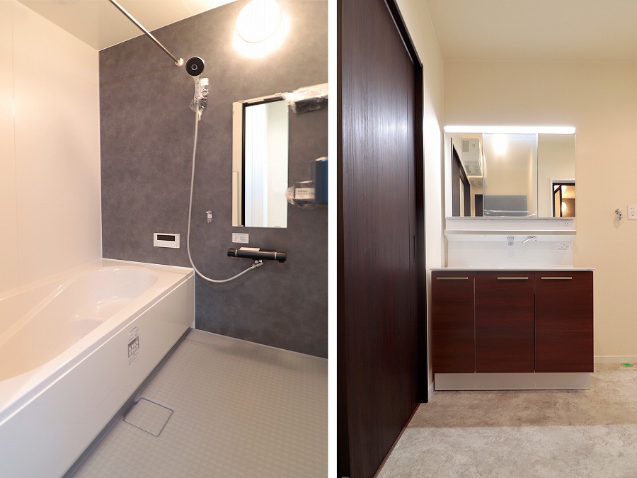 グレイッシュな色調の浴室とダークウォールナットの洗面台は、素材の風合いが生きる穏やかな仕上がり。