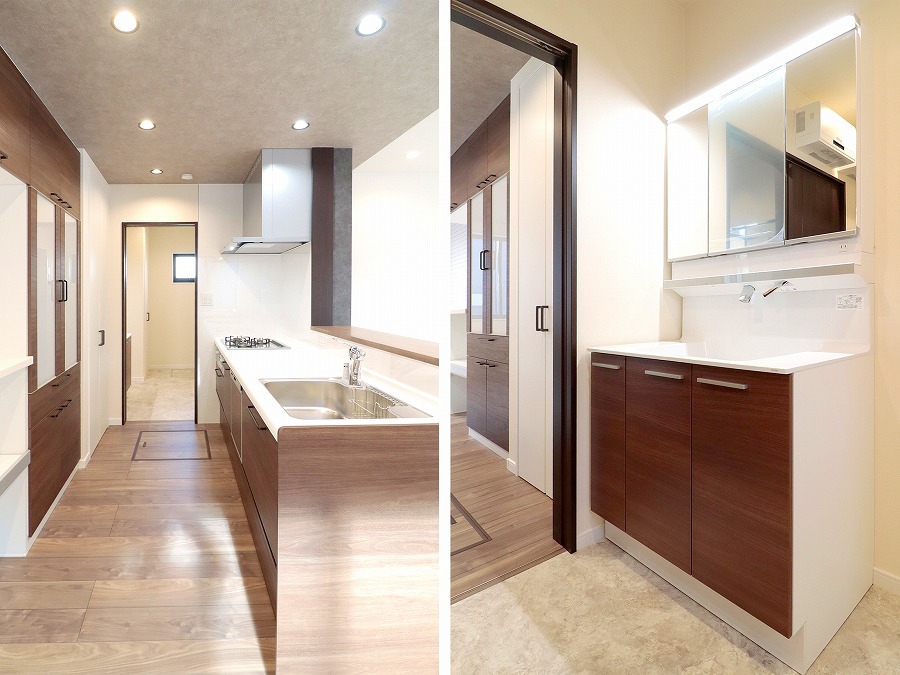 キッチンと洗面室を隣接させ、快適な家事導線を実現。日常の動きやすさを高めるための工夫です。