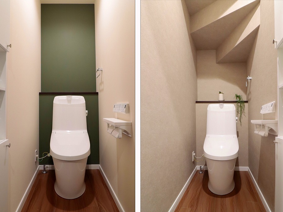 家全体のトーンを意識しながら仕上げたトイレは、アクセントクロスとカウンターで上品な印象に。