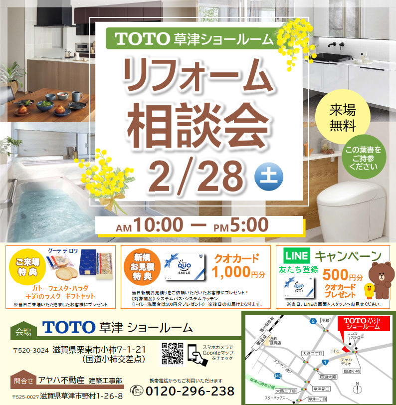 アヤホーム草津店はアクセスの良い草津駅西側にあり、駐車場もございます。1軒まるごとリノベーションから、水回りの簡単リフォームまでプロが暮らしやすい空間のご提案をさせて頂きます。お気軽にお問い合わせください。