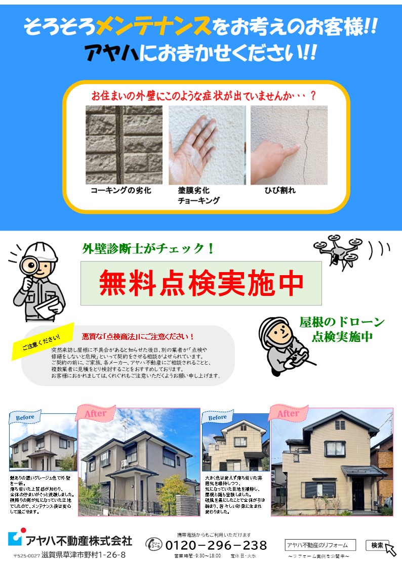 そろそろお家の外まわりメンテナンスをお考えでしたら、アヤハ不動産のリフォームにおまかせください! 無料点検も承っております。 ホームページでは、実例を公開しています。上品な外観に生まれ変わった実例をぜひご覧ください。