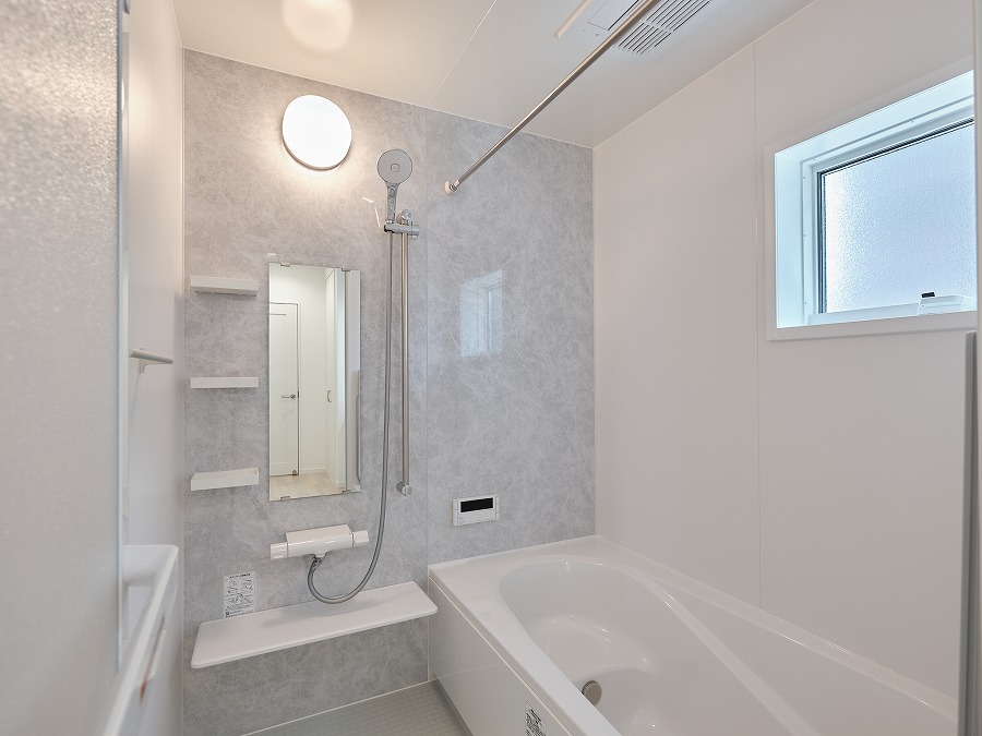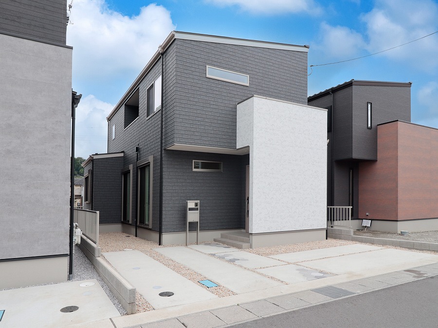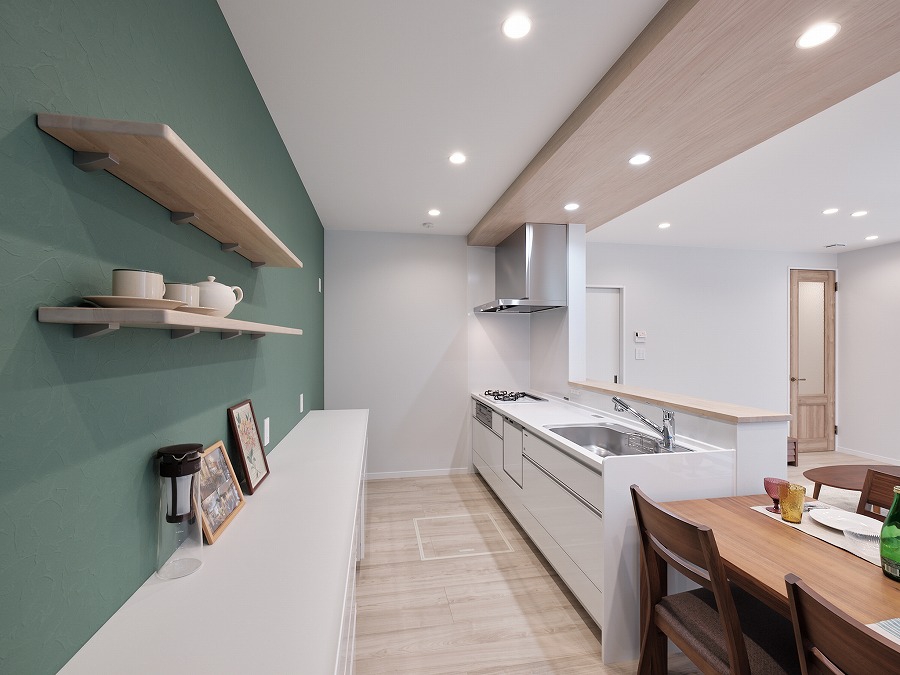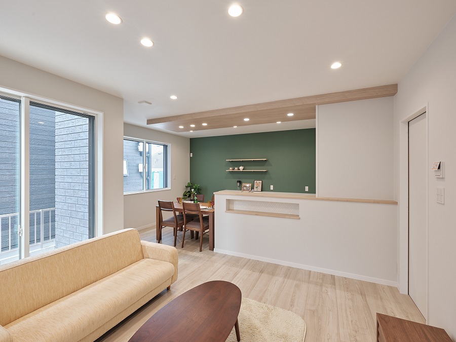 こだわりのLDKはクロスをライトグレーの塗り調を採用し、モダンな空間を演出。 キッチンカウンターのニッチのクロスも主張しすぎず、コーディネートの幅も広がります。 シンプル&スタイリッシュスタイル ★ZEH水準省エネ住宅★ ◇玄関ドアポケットキー・1階シャッター雨戸電動式採用◇