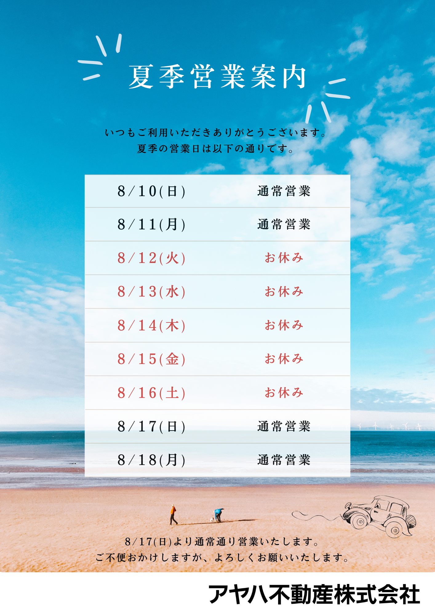 【夏季休業のお知らせ】2025年8月12日(火)~16(土)