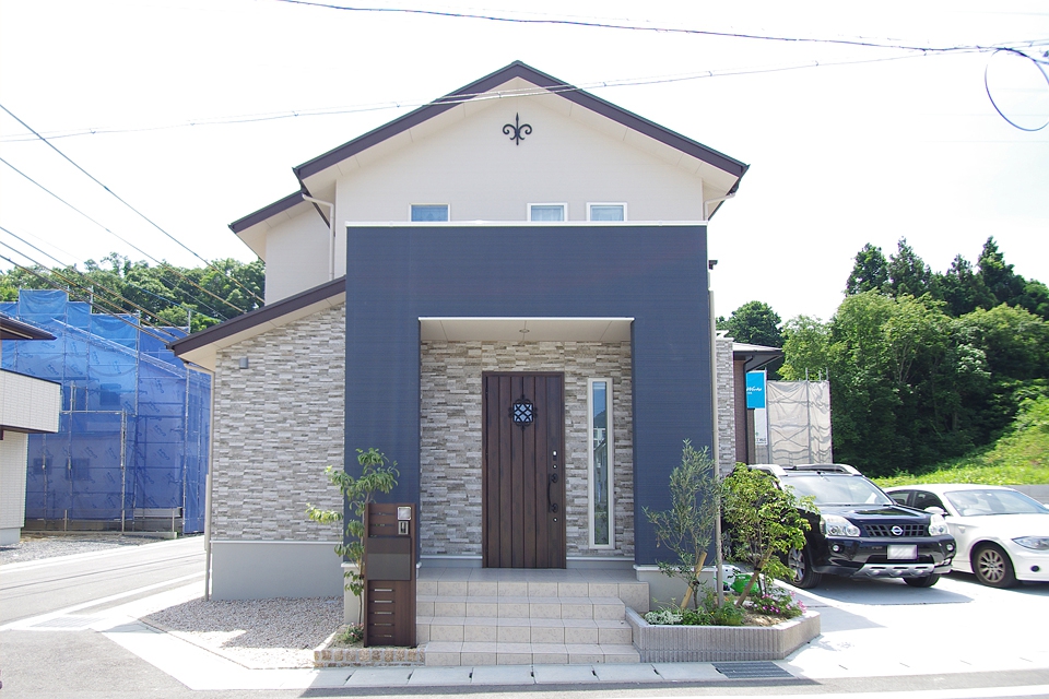 門構えのような意匠と切妻屋根のライン、オーナメントを濃紺で統一した印象的な外観。外観のアクセントカラーである濃紺をリビングと和室のインテリアにも取り入れた。リビングの見せ梁は、セピアカラーがシックでおしゃれなポイントになっている。そのほか壁ニッチや、エコカラットを貼ったアクセント壁など自分たちの好きを詰め込みました。