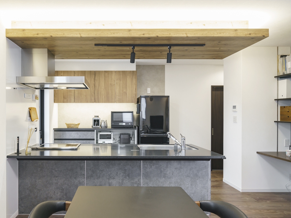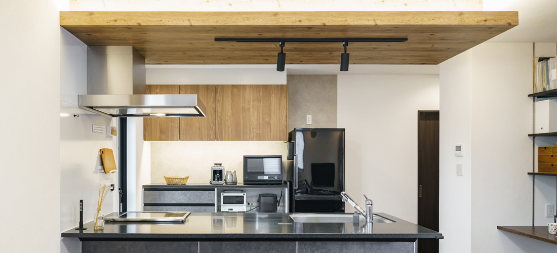 料理好きのご主人が選んだフラットカウンターのキッチン。天井部と吊戸下の間接照明でおしゃれな雰囲気を演出しています。