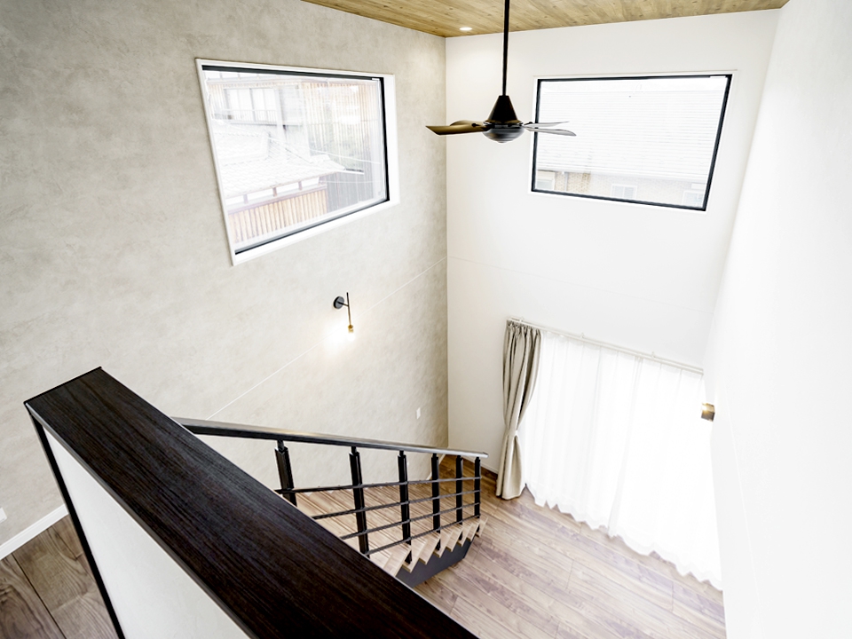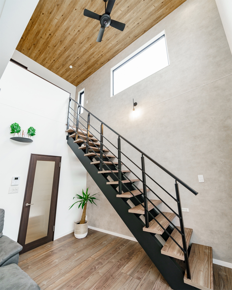 開放感をもたらす吹抜け階段。手すりや側桁のブラックカラーを効かせた空間コーディネートです。