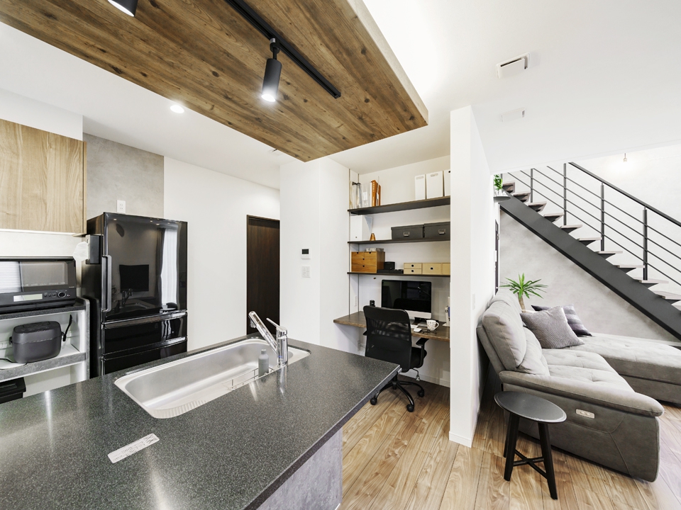 週の半分以上がリモートワークの奥様がメインで使うワークスペース。集中できるがキッチンも近く、リビングから雑然と見えないベストなレイアウトを実現しました。