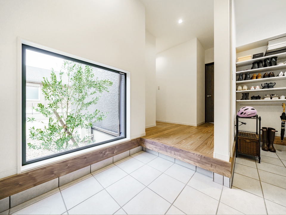 玄関を入って正面のピクチャーウィンドウからオリーブの木がお出迎え。容量たっぷりシューズクロゼットは土間でつながっています。