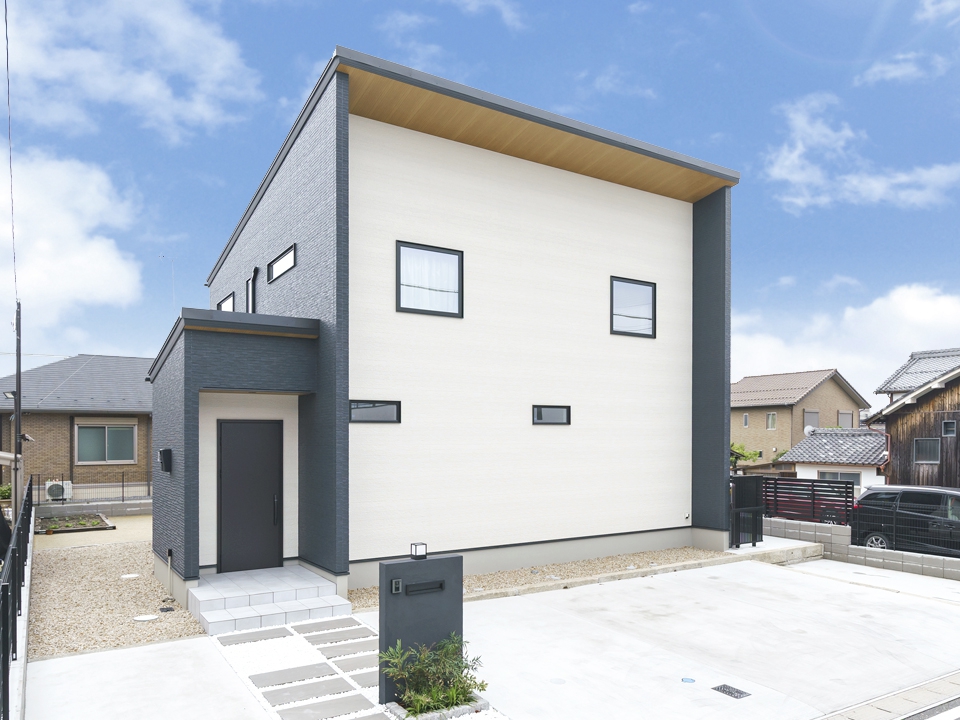 白とネイビーを組み合わせたハコ型のフォルムがスッキリと見える外観。軒部分にあしらった板天井風の外壁材がアクセント。