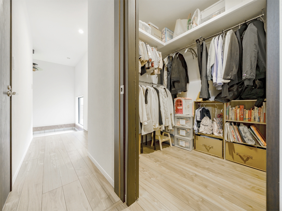 玄関ホールからつながるファミリークローゼット。洗濯室、キッチンへ短い動線で行き来できるのが嬉しい。