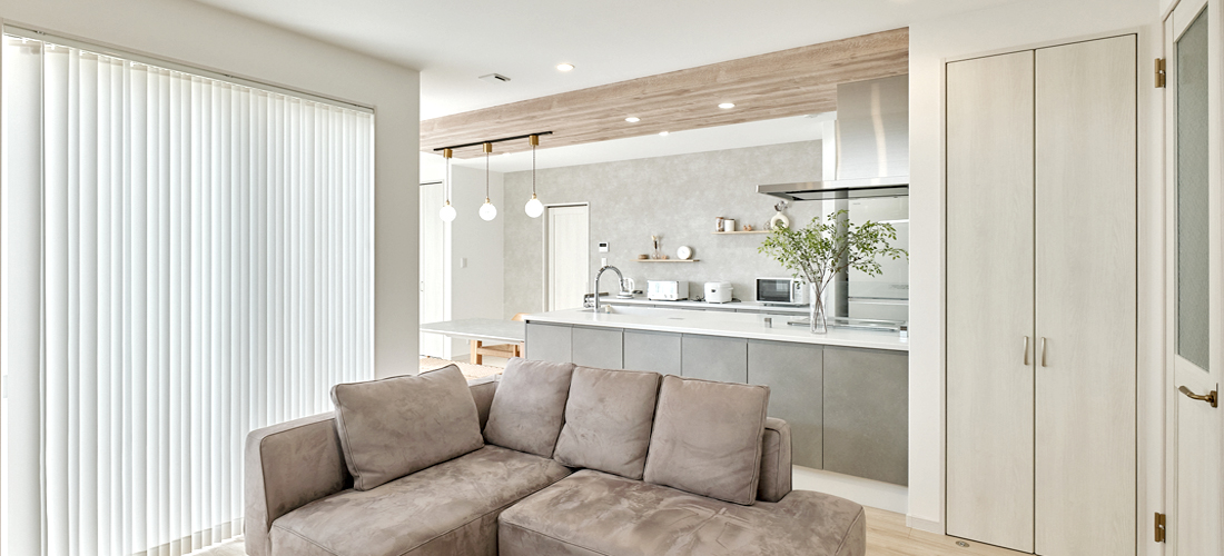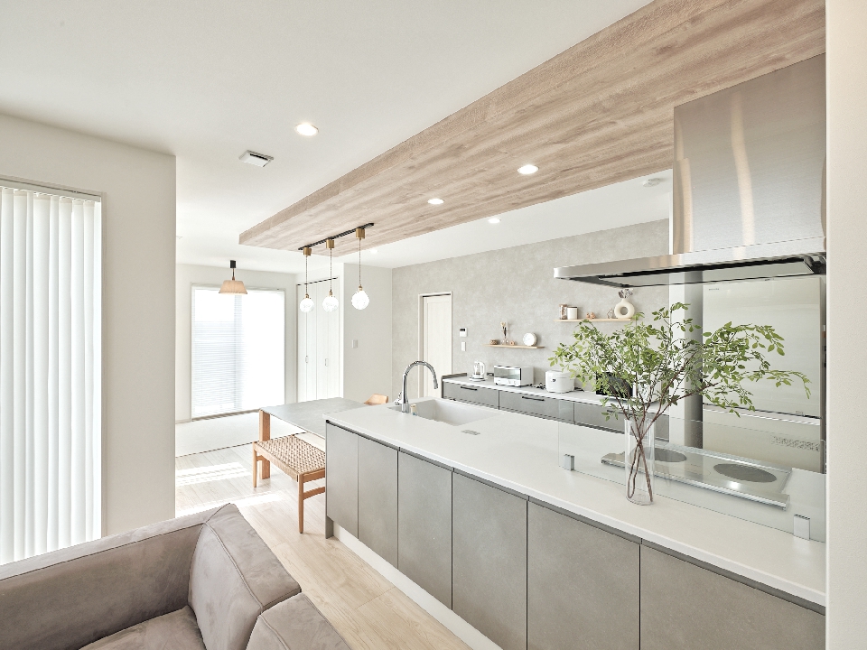 木目の折下天井が空間に奥行きとリズムを生み出し、開放感のあるLDKに心地よいアクセントが加わります。 照明計画にもこだわり、ダウンライトとペンダントライトをバランスよく配置。