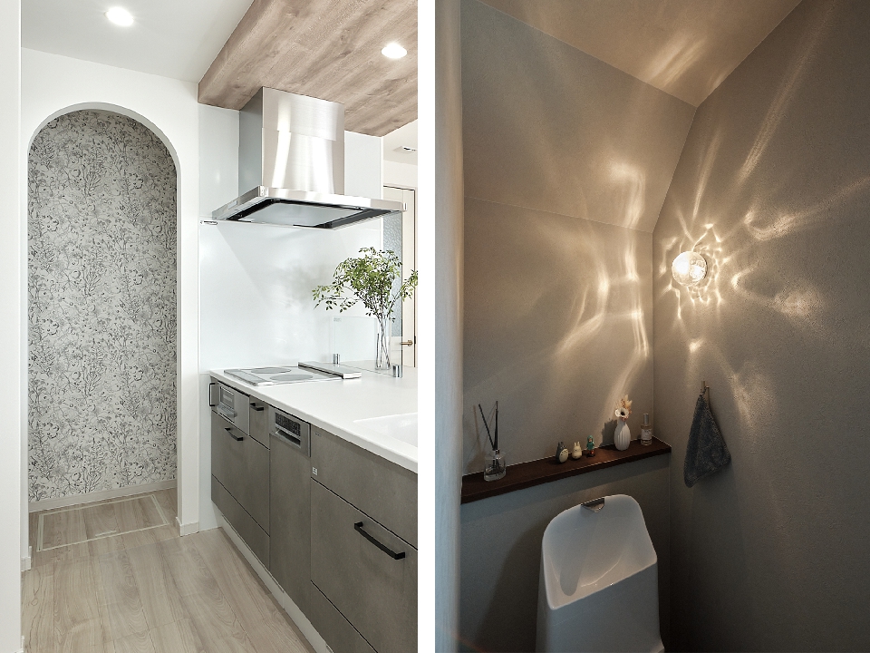壁に映し出される繊細な光の模様が、トイレ空間に上質なアクセントを添えます。 あえてシンプルな内装にすることで、照明の美しさが際立ち、落ち着きと遊び心を両立した空間に。