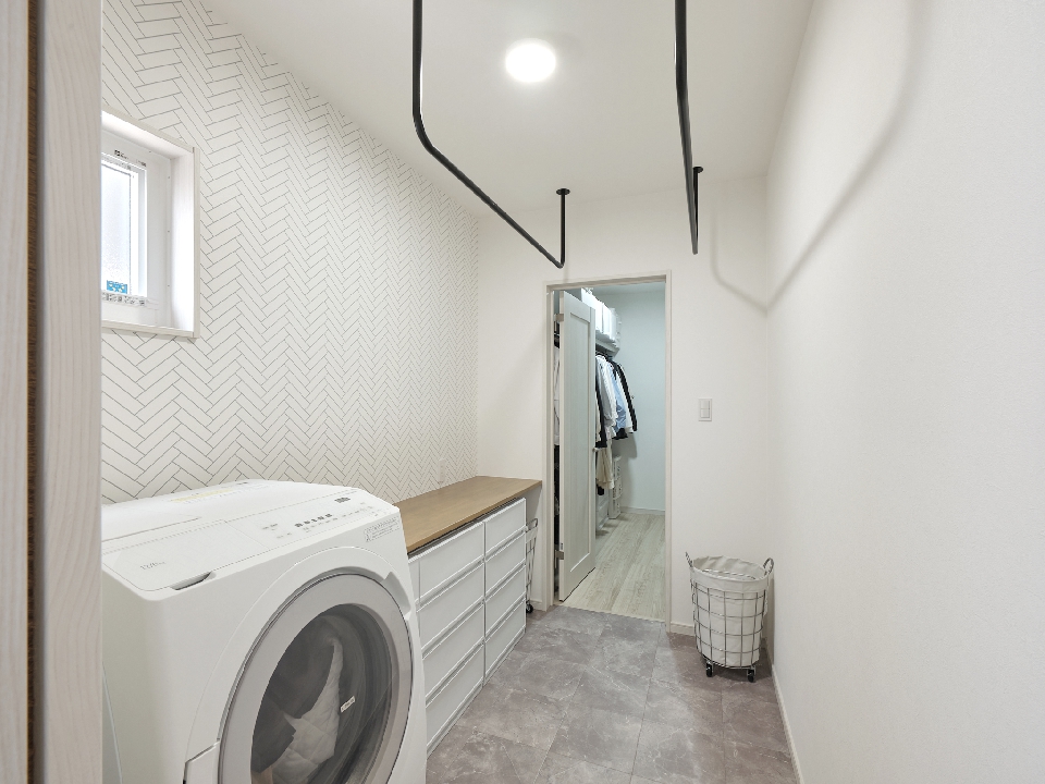 壁面には淡いトーンのヘリンボーン柄クロスを採用。グレーの床タイルやブラックのハンガーパイプとのコントラストが、洗練された印象のランドリールーム。