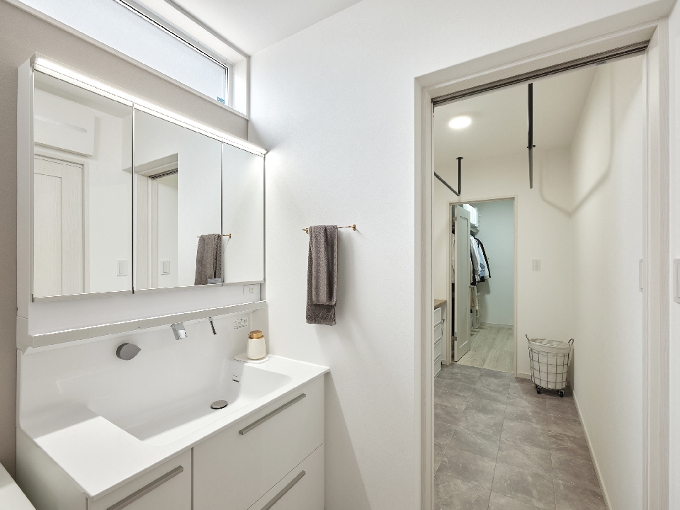 洗面室の奥にランドリールーム、さらにその奥にファミリークローゼットを配置。家事動線がスムーズになる、忙しい毎日を支える大きな工夫です。