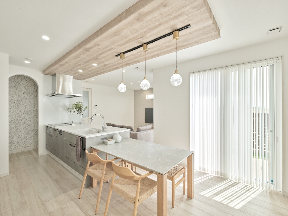 大きな窓から差し込む自然光が、空間全体を明るく包み込みます。 機能性と美しさを兼ね備えた、家族が自然と集まる心地よいキッチン・ダイニングに仕上げました。