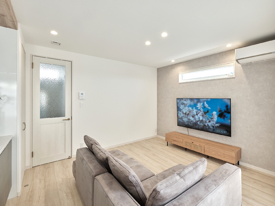 チェスナットの床と白壁が、空間に開放感と清潔感をもたらすリビング。 天井のダウンライトやドアハンドルの色まで、細部にこだわった施工でシンプルながらも上質な空間を実現しました。