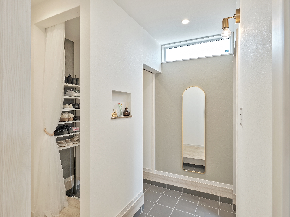 自然光が差し込む高窓と、ゴールドフレームのミラーが空間に上質な明るさをもたらす玄関ホール。 オープンな土間収納は透け感のあるカーテンをあしらい、生活感をやさしく包み込みます。