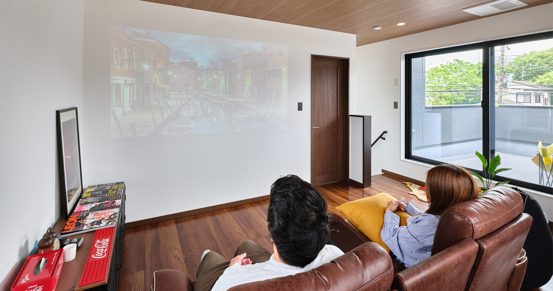 お気に入りの家具に合わせて、内装や間取りもこだわりました。1階でほとんどの生活が完結する設計により将来を見据えた快適な暮らしを実現しています。利便性とデザイン性を兼ね備えた理想の空間に仕上がりました。広いバルコニーとシアタールームの繋がり