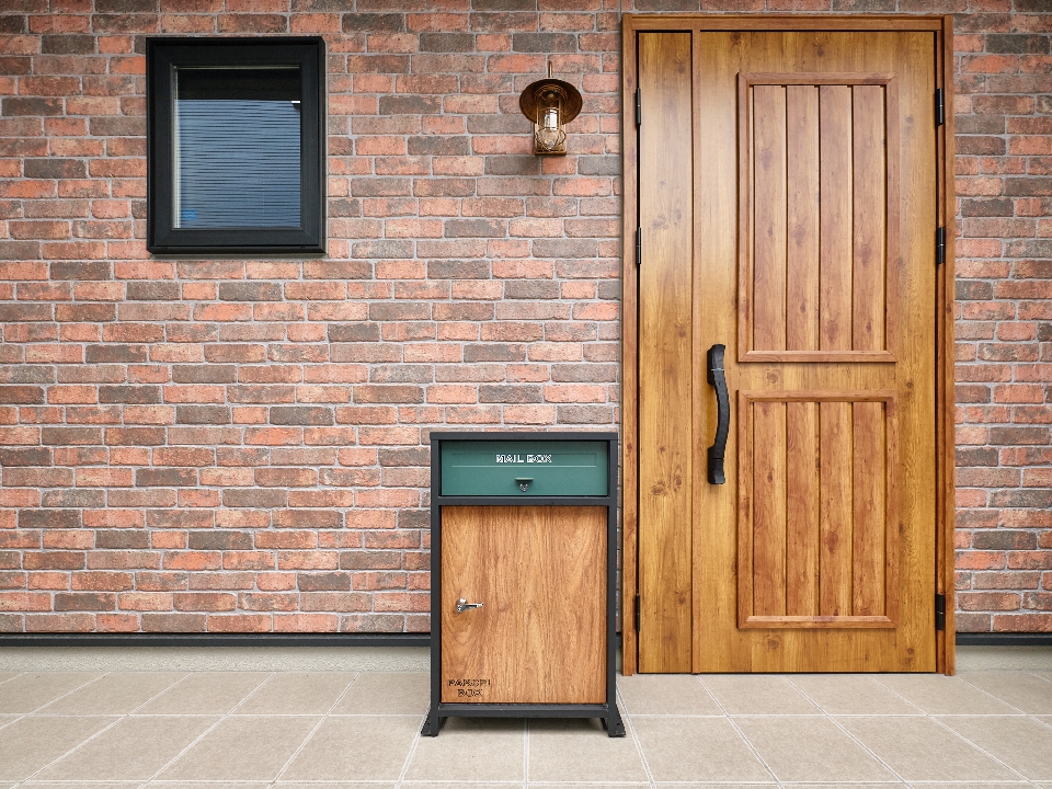 重厚感のあるレンガ調外壁。住まいの第一印象を決める玄関だからこそ、照明器具や宅配ボックスなどこだわりを詰めた空間に。
