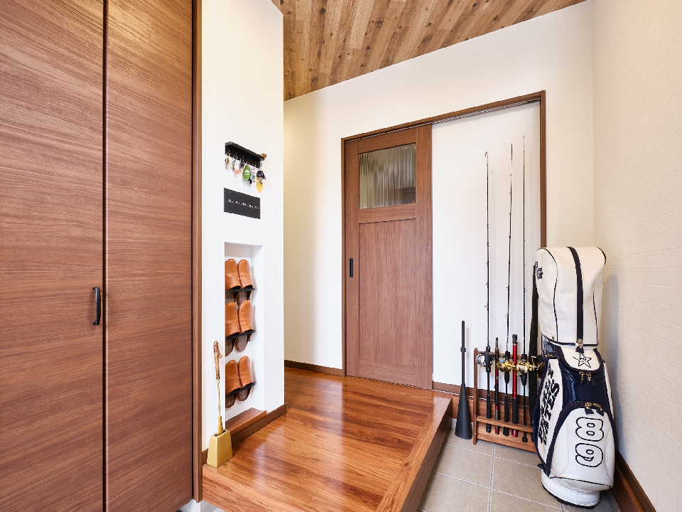 スリッパニッチ、照明スイッチやキーフックにこだわり、機能美とデザイン性を両立した玄関ホール。