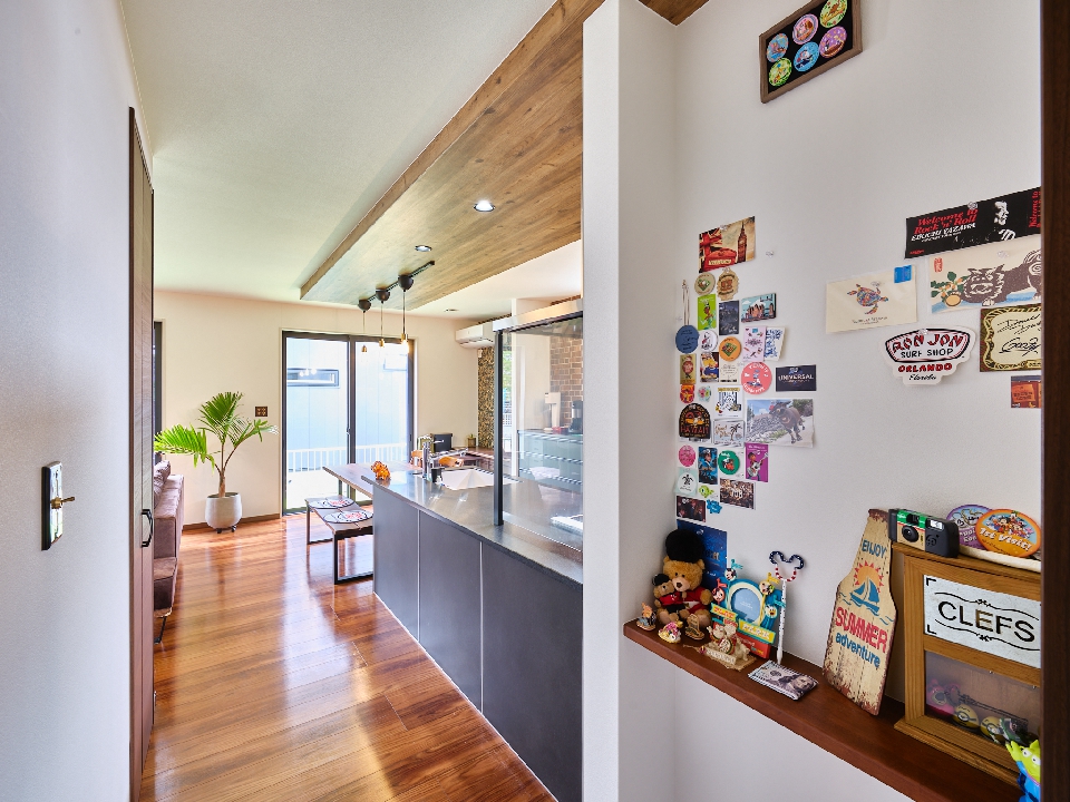 LDKの一角に設けた壁マグネット仕様の飾り棚は、家族の思い出やお気に入りの雑貨を自由に飾れるスペース。暮らしに遊び心と個性を加える、こだわりの空間に。