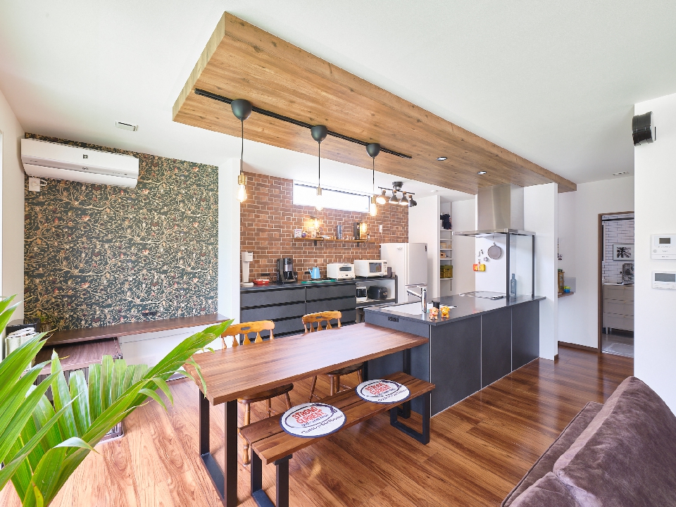 キッチンとダイニングテーブルを横並びに配置したことで、料理と食事の動線がスムーズに。木目調の折下天井と床が温もりを演出し、黒のキッチン収納やレンガ調のアクセントクロスが空間に落ち着きをプラス。