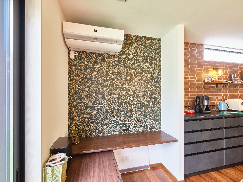 キッチン横のカウンタースペースの壁には、お施主様こだわりのアクセントクロスを採用。日常の中に物語の世界観を取り入れた、遊び心あふれる空間に。