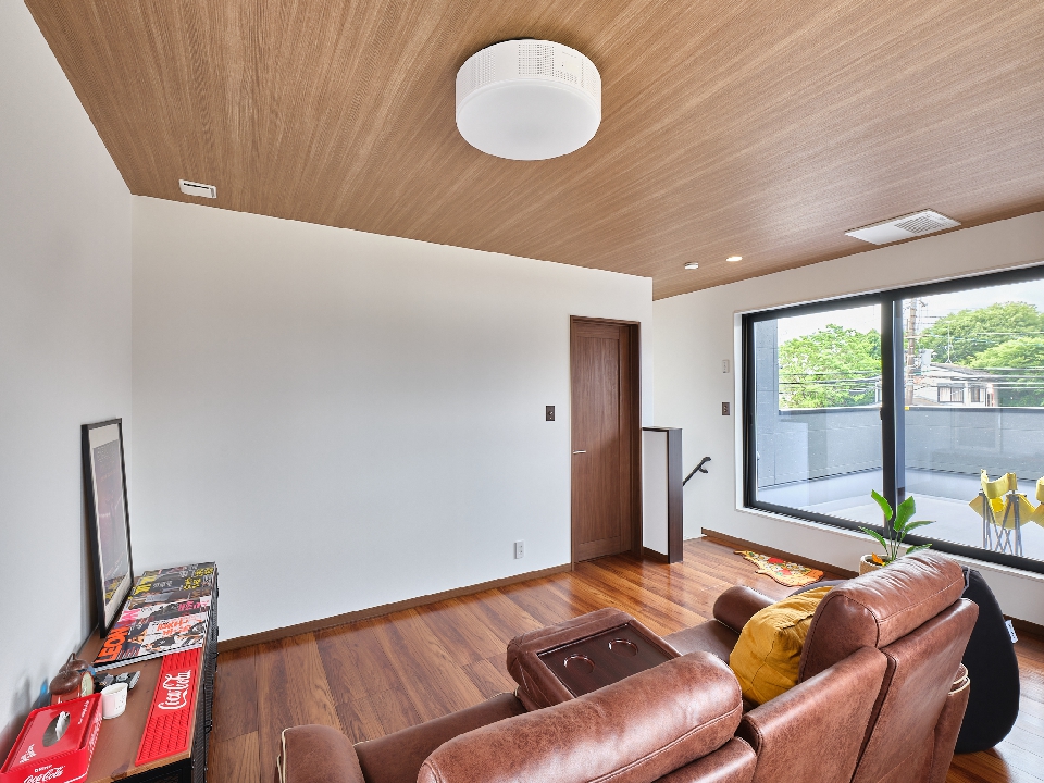 木目調の天井と床が落ち着いた雰囲気を演出するシアタールーム。窓からの自然光も取り入れられる設計で、昼夜問わず心地よく過ごせる空間です。趣味やリラックスタイムにぴったりな、暮らしに彩りを添える一室です。