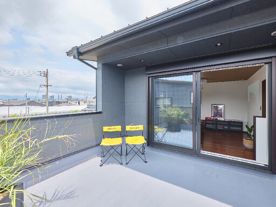 シアタールームから行き来出来る広々8帖のバルコニーは、気軽に外の空気を楽しめる憩いのスペース。暮らしにアウトドアの楽しさを取り入れた、開放感あふれる空間に。
