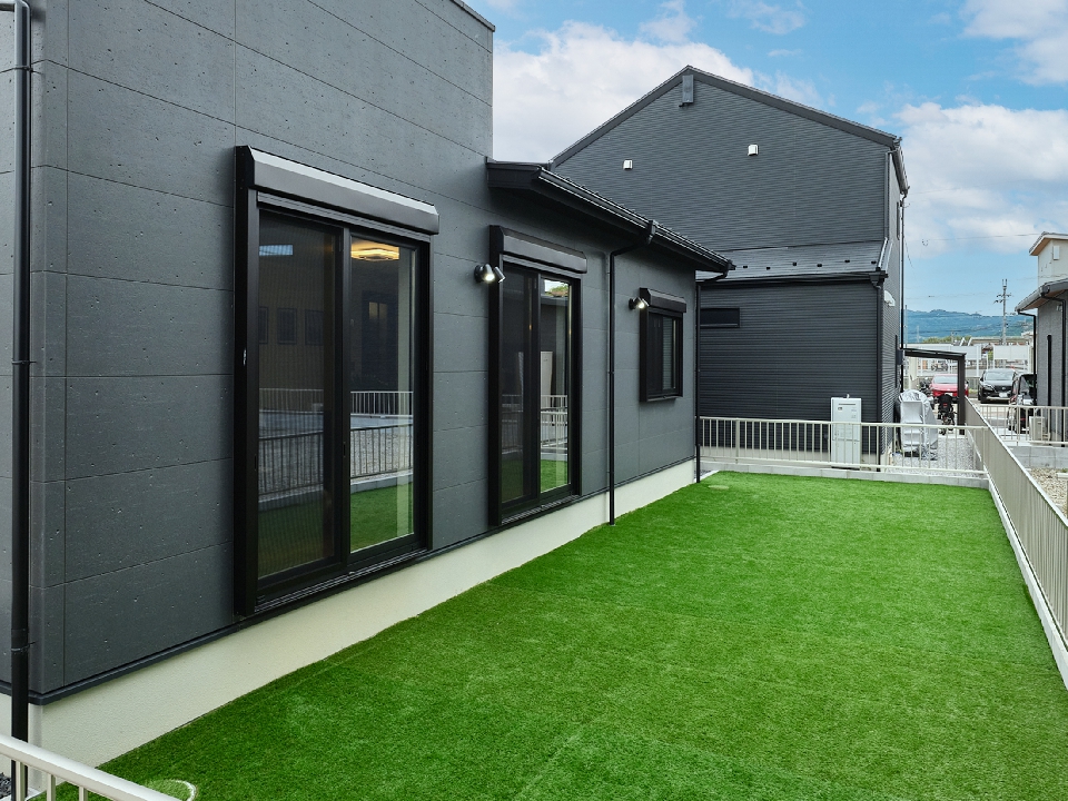 黒を基調とした外壁に、大きな窓が開放感を演出。広いお庭に敷き詰めた芝生が、住まい全体にやさしい彩りを添えています。