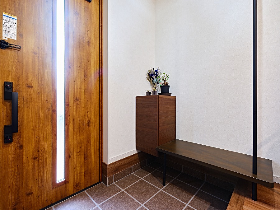 玄関に設けたベンチは、靴の脱ぎ履きやちょっとした荷物置きに便利。暮らしやすさを考えたこだわりのポイントです。