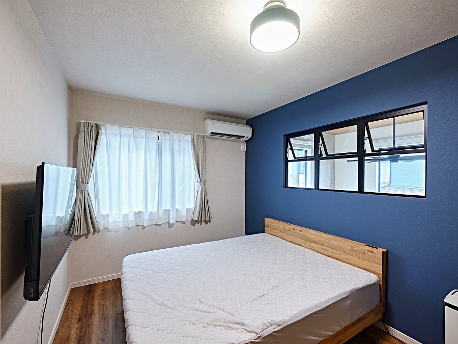 アクセントクロスが映える2F寝室。室内窓からはLDKを見下ろせる設計で、家族の気配を感じながら過ごせます。